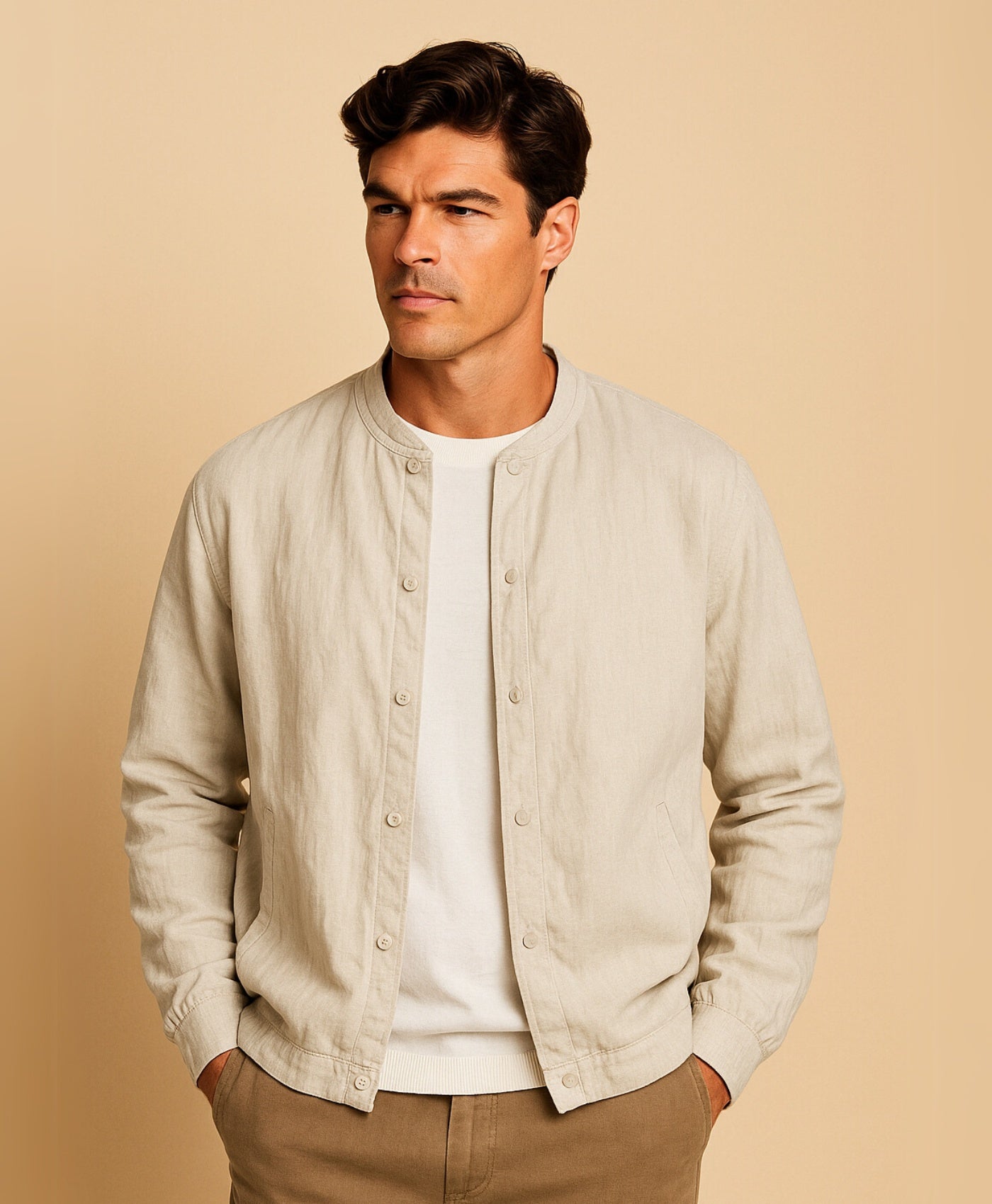 Gemaakt van ademend linnen met een subtiele structuur biedt deze jas de ideale balans tussen comfort en klasse. Perfect voor frisse ochtenden, lange avonden of als stijlvolle laag tijdens je reis.